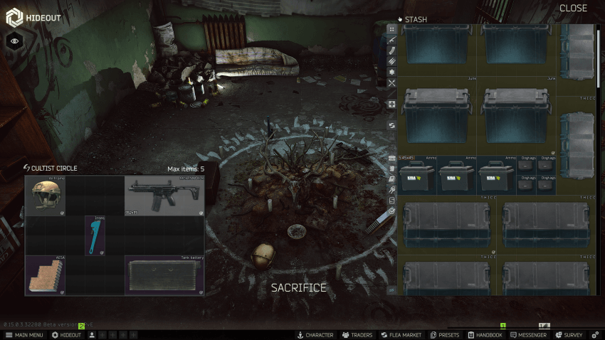 타르코프 0.15 패치의 축복, 광신도 제단! 이제 무지성으로 MP5만 넣지 마시고, CultistCircle.com 켜두고 창고 정리도 할 겸 잡템들을 조합해 보세요. 여러분의 창고에 탱크 배터리가 가득하길 기원합니다!