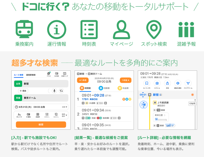 일본인들이 가장 많이 쓰는 교통 앱입니다. 구글 지도가 단순히 '어디서 타라'고만 알려준다면, 이 앱은 환승 시간을 1분이라도 줄여주는 미친 디테일을 자랑합니다.