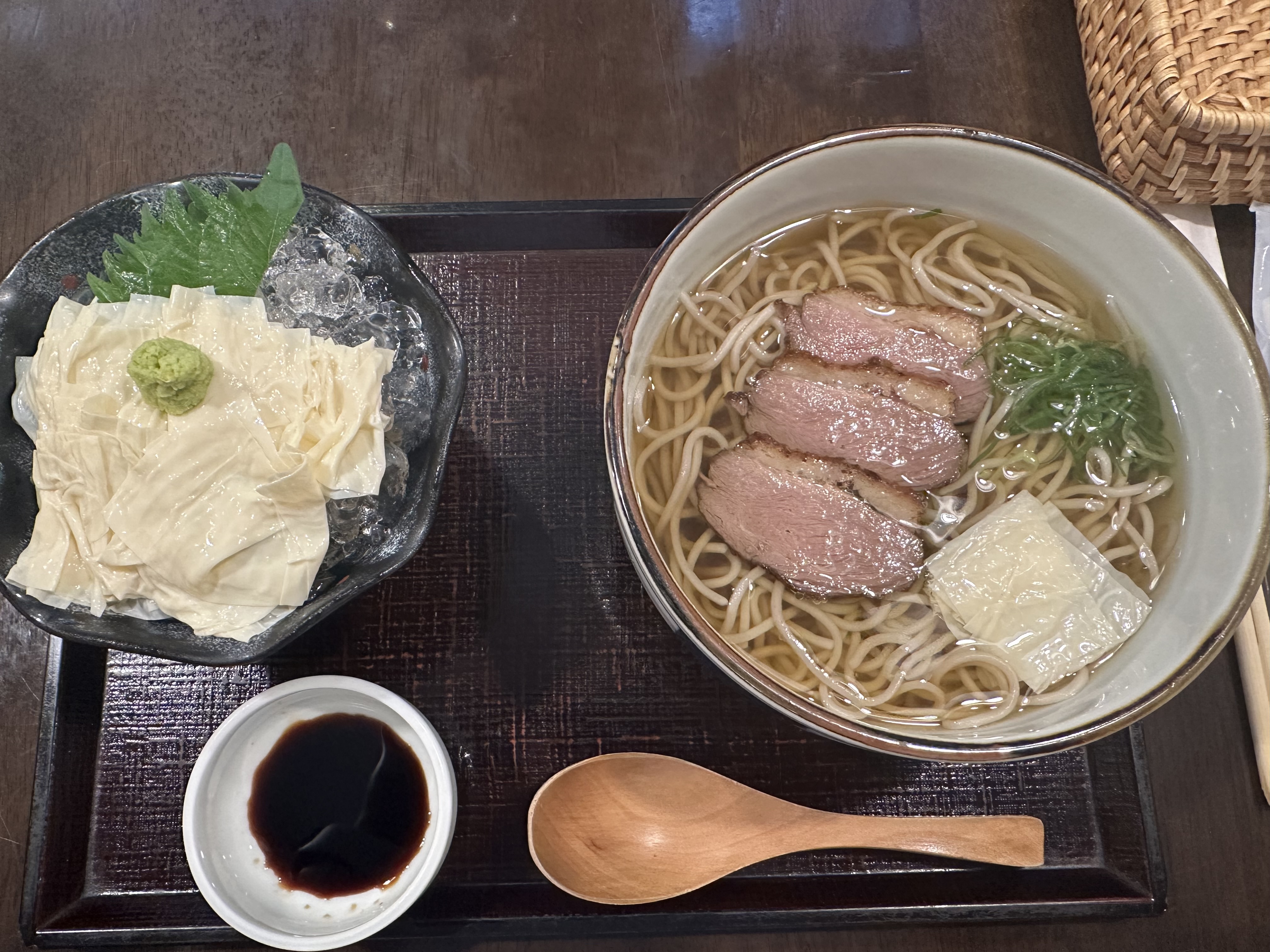 나는 이 집의 시그니쳐 메뉴로 보였던 카모소바로 주문해봤다. 단품도 있고 세트로 주문하면 왼쪽에 보이는 두부피를 얇게 썰어서 준다