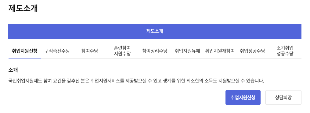 지원 신청은 어렵지 않습니다. 위 국민취업지원제도 사이트에 접속, 로그인 후 취업지원 신청을 통해서 진행 할 수 있습니다.
